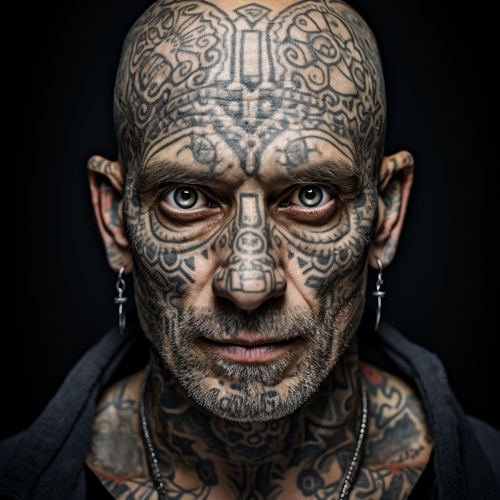 a gang member in a futuristic cyberpunk world. He has blond hair and blue eyes. He has snow tatoos. We can see that he carries one sniper riffle in his back. He was a military in the time. He wears a grey jacket and a dark green bandana around his neck. It take place in a tropical city. full body --ar 1:2