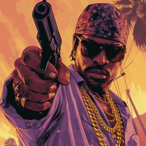 GTA cover style, comic style, bandit with a gun in stylish clothes and gold chains --s 250 --v 6.0