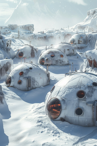 A frozen ice planet, hyper-realistic cinematic scene, photorealistic 8K A series of dome-shaped habitats clustered together, showing signs of human life and activity despite the harsh environment Icy tundra and snowdrifts surrounding the habitats, with a frigid, alien landscape stretching into the distance Intricate details of the domed structures, with windows, airlocks, and other features visible, hinting at the living spaces within Signs of technology and infrastructure for sustaining life, such as power lines, ventilation systems, and transport vehicles Subtle visual storytelling elements suggesting the challenges and resilience of human settlers on this inhospitable world --ar 2:3 --v 6.0