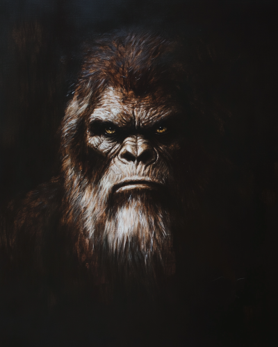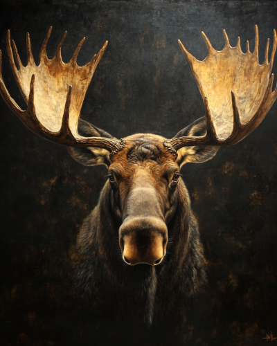 Rembrandt's painting depicting front view our subject looks down at us, portrait of a massive moose towering over us with a strong jaw, looking serious but relaxed, very realistic image and dramatic lighting deep blacks --ar 4:5