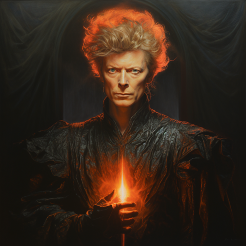 David Bowie with a halo, staring at the camera as painted by Rembrandt, dark colors, backlit