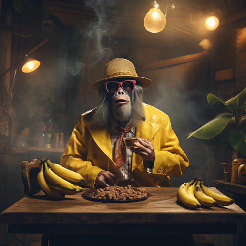 an abstract impressionism full body shot of a black and white chimpanzee, with a thoughtful expression, smoking a cigar. The chimpanzee's face is adorned with paint smudges in a polka dot pattern, giving it an artistic and abstract look. The background is minimalist, focusing all attention on the chimpanzee's face and the smoke from the cigar creating a contemplative atmosphere --v 6.0 --style raw --ar 1:1