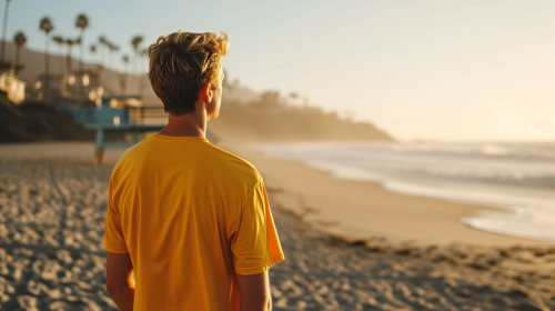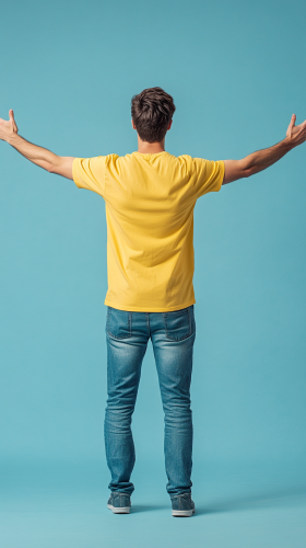full body side back view of a man wearing yellow t-shirt and jeans, with an open mouth positive wow impression, one extended raised arm, hand's palm upwords, hyper realistic, rear side back view, studio shot --ar 9:16