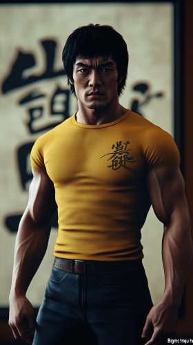 Cinematic shot of Bruce Lee in a yellow t-shirt, with black hair and a Chinese character on the wall behind him, "Bigmì tròu hái", photorealistic, detailed skin texture, detailed eyes, detailed background, full-body shot, action pose, depth of field, cinematic lighting, high-resolution photography, high-quality details. --ar 9:16