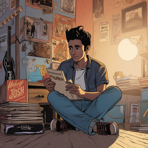 disney comic style: a indian teenager in the age 17 who is wearing denim shirt and jeans dreams about buying bruce springsteen merch
