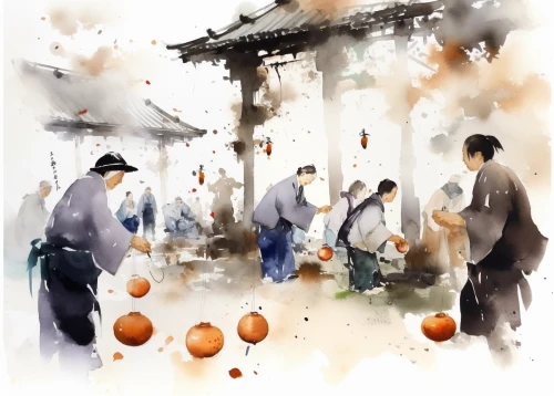 bean-throwing festival in japan,people in traditional japanese clothes throwing beans in a temple, japanese white lanterns, painting in water color on white background, japanese style painting --ar 216:156 --v 5