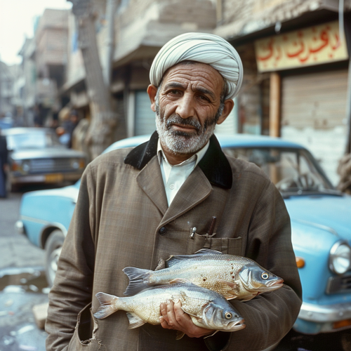 iran, Tehran, 1980, nowruz, bazaar, old car, peykan, a man with 2 fishes in his hand, spring, sabzeh--Photography--v:6.0--s 300