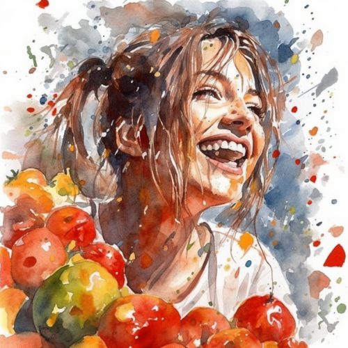 the joy of La Tomatina is a gorgeous young woman surrounded by flying ripe tomatoes and other people, watercolors --v 5.0