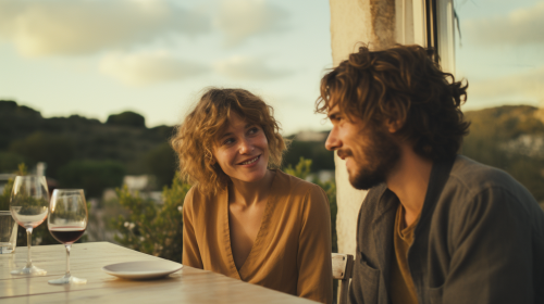 35 mm lens ari alexa 4k hyper realistic cinematic image of dinner table in a beautiful fancy landscape with a modern and funny fancy like a boho woman and a dark cloths men cine man 45 years old couple of lovers one spain Brown and curly short hair men and a woman brown blonde large hairwoman style william eggelston, in Mallorca --ar 16:9