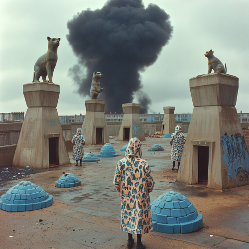 1970s editorial documentary photography, in style of english social realism, Background is a belfast council estate, in the distance and central is a huge plume of black smoke, front and central are peoplein animal patterned raincoats standing in small postmodern concrete towers eith concrete block turrets, scattered are little blue stone cobbled igloo structures, graffiti, somber atmosphere, large towering postmodern reinforced concrete mutated animal statues, drizzle rain, subdued overcast winter sunlight harsh flash, multple creative angles, detailed, shot on a Yashica FX-3 Super 2000 camera with grainy Kodak ultra 400 film, 80mm lens, , realistic skin tone, blushed skin, sharp details --no deformed limbs --stylize 500 --weird 3 --v 6.1