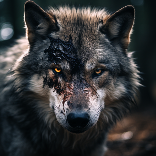 beautiful wolf , with a scar on one eye, cinematic light, ultra realistic photo