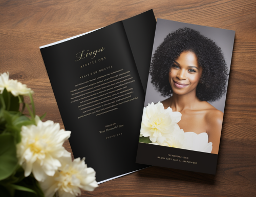 A funeral program in black gloss paper with dark gold bolded writing with an cinematic lighting photorealistic photograph of a 50 year old lightly tanned Biracial Black man on the cover page and two white flowers on the lower page, detail, --ar 22:17