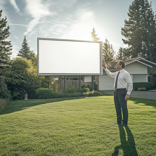 business man standing on his front lawn looking confused at a large billboard that has been installed in his neighbors lawn happily waving hello, photorealistic