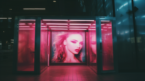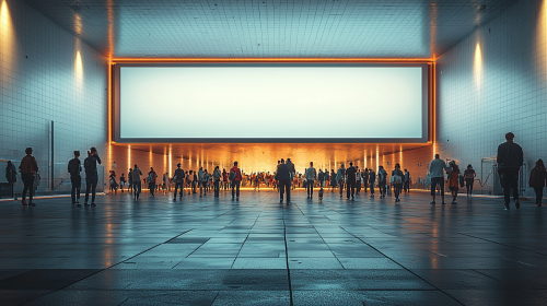 A realistic photograph of a white tiled wall in a modern building. there are a lot of people . Mounted on the wall is a large glowing advertising billboard with an empty space in the center for custom content. The billboard emits a soft, bright light, contrasting with the clean, sleek surface of the white tiles. The modern architectural elements of the space, like metal or glass accents, are visible in the background, enhancing the contemporary atmosphere. The overall composition is framed for a large, high-resolution stock photo, with ample space around the billboard for versatility in usage. Realistic photography, modern architecture, glowing billboard, clean white tiles --ar 16:9 --q 2 --s 750