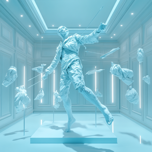 photorealistic image of a minmalist luxury fashion retail store with the sculpture of an old man's body impaled by arrows, art installation, art gallery, blue. stylised, high fashion