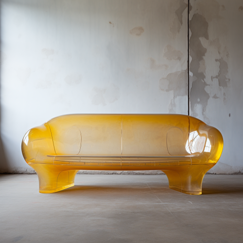 a film photo of a 1960s spaceage resin sofa in an empty concrete space, clear matte resin, muted yellow, tonal, darker in areas, imperfections, organic molded shape
