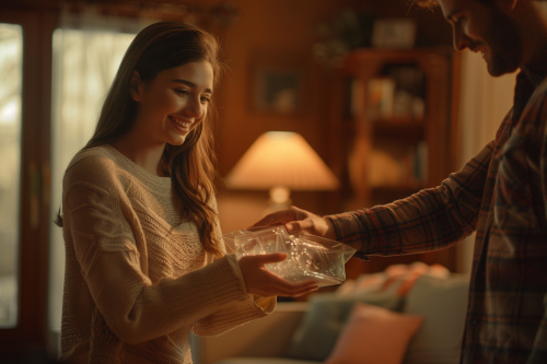 A Carl Moving team member carefully handing over a fragile glass item to a smiling young woman, their hands connecting in the exchange, soft and warm lighting that enhances detail, living room setting with family portraits, high-definition quality, warm tones, Canon soft focus --ar 3:2 --v 6.0