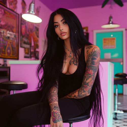 A magazine photoshoot quality photo of a beautiful girl with long black hair full of tattoos with full lips and big eyes and long eyelashes and tan skin wearing all black sitting on a stool in a pastel pink and purple tattoo shop
