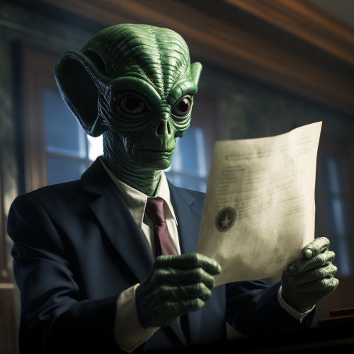 imagine a photorealistic version of a alien handing a document over to a us offical