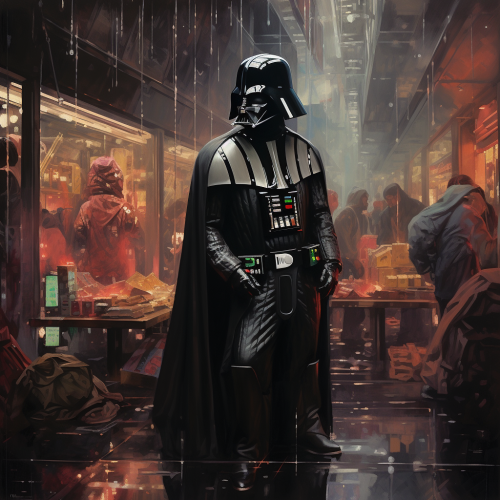Darth Vader, in a pawn shop, in space, other people in it, raining outside