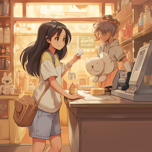 anime girl shopping in shoes shop , She is sitting in a small chair and trying on some shoes. a warm atmosphere. Nice shoes are displayed on the wall. In the style of Japanese anime. A detailed illustration in the style of Japanese anime. A high angle shot. contemporary city view, light gray and brawn --ar 4:5 --niji 5