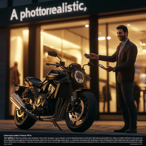 "A photorealistic, high-definition cinematic scene featuring a stylish, modern motorcycle parked in front of a contemporary financial office. The lighting is meticulously crafted to capture the gleaming details of the motorcycle's sleek design, with realistic reflections glinting off the polished chrome. In the foreground, a sharply dressed businessperson hands over a set of keys to a smiling client, the focus and depth of field creating a cinematic effect that draws attention to this pivotal moment. The urban backdrop is alive with rich, true-to-life colors and textures, featuring a blend of modern architecture and city life, highlighting the convenience and accessibility of the motorcycle loan service. Every element is rendered with the precision and clarity of a high-end movie scene, bringing the concept to life with striking realism."