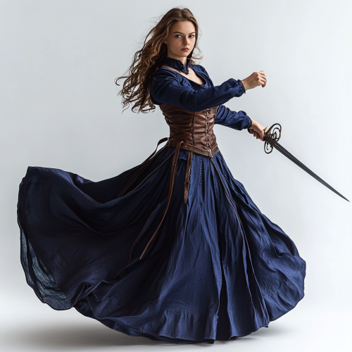 A young adult girl wearing a navy blue dress. She is holding a rapier. Her dress dances and flows with her movements. She is wearing brown leather armor over her dress. On a white background.