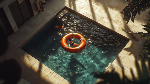 hyper realistic photo, an overhead view of a pool in a house, a person is floating with a life preserver in the shape of a soda can, other people are enjoying themselves around, the situation is at sunset, the situation is very well illuminated with light natural. 75 mm lens, production quality, depth of field, cinema photography, color grading, exquisite detail, sharp-focus, intricately-detailed, long exposure time, f/2.8, diffuse-back-light, award winning photography, hyper realistic, unreal engine, realistic lense flare, Cinematic Lighting, Studio Lighting, Beautiful Lighting, Accent Lighting, Global Illumination, Ray Tracing Global Illumination, Ray Tracing Reflections, Lumen Reflections, Screen Space Reflections, Anti-Aliasing, FKAA, TXAA, RTX, SSAO, Shaders , OpenGL-Shaders, elegant, 4K, --ar 16:9