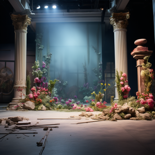 a cinematographer's camera setup in modern studio, studio lights in background, the set has a couple of chairs ready for educational discussion, lighting in background is dim, shallow depth of field, shot on nikon Z7 --s 500 --v 6.0