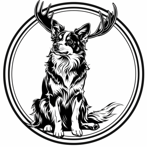 clean Logo of a border collie shepherd dog sitting, the dog has antlers like a moose, single color background, sticker design circle border, vector, black and white