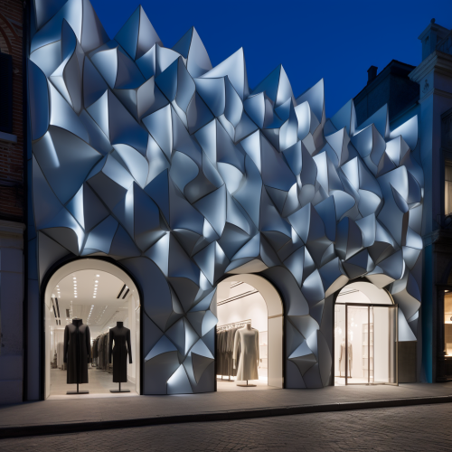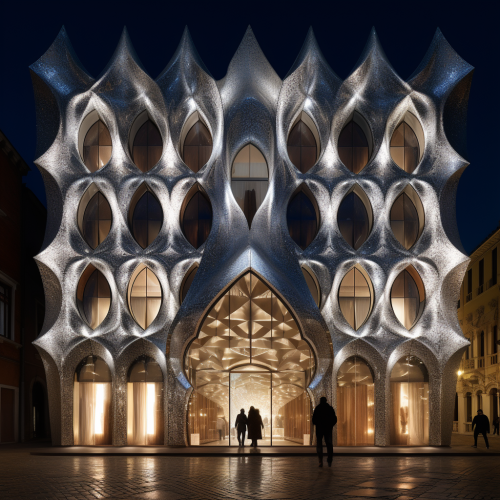 nighttime exterior view of a concept palace in Venice, concept store on the ground floor with facade made in silk and design inspired by tesselation geometry, high end shop, exterior design, photography, pixelate facade by volumes, hyper detailed, photography, high definition