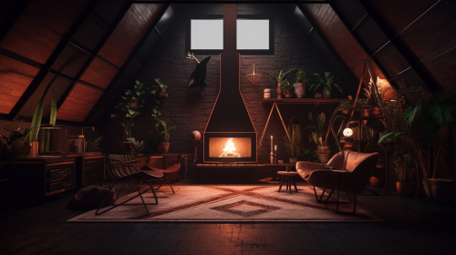 A sectional view of a modern black wood cabin in the raining forest. The cabin has a small open garden structured at center of the floor plan and separated by tall glass, each room of the floor has one sided glass panel wall from the center with bunk beds . The cabin has three floors with A shape roof with pierced peak center. The black wooden walls create a sleek exterior. Only the central glass panel offers a view of the weather conditions.