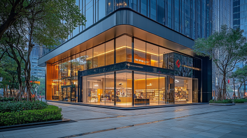 A portfolio of 6 photos of high-end retail stores in Taiwan, showing the elegant appearance and spacious and bright display space. The picture should include a modern retail store located in a bustling business district in a Taiwanese city, with large floor-to-ceiling glass windows, exquisite interior decoration and neatly displayed merchandise. The environment is clean and bright, showing a comfortable shopping atmosphere and attracting customers to stop. Photos should emphasize the prime location and attractiveness of the retail store in a high-end location to provide inspiration for entrepreneurs leasing retail space.