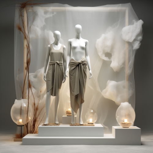 window display , 1 man , 1 woman , light outfit , JELLY ELEMENTS DIFFERENT SHAPES PODIUMS NEUTRAL ENVIRONMENT R E S I N The neutral walls of the window will emphatized resin semi transparent elements. This “jelly” podiums will have different shapes and heights, DIFFERENT SHAPES PODIUMS, NEUTRAL ENVIRONMENT, R E S I N, SURFACES GLASS RESIN TEXTURE SET UP M AT T E R E S I N A mix of semi transparent and matte resin podiums create a play of surfaces and they are used as display bases for bags and accessories. GLASS RESIN TEXTURE, SET UP M AT T E R E S I N A