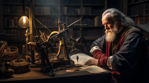 Galileo observing the stars with a sextant and an astronomical telescope in his 1500 laboratory, windows, stars, science objects, Beautifull picture awards winner , really pure aesthetic, Masterpiece photo , magasine style photography, taken on a Canon EOS R5 F1. 2 ISO100 35MM, ultra realistic lights , real colors , ultra-details , hyper-detailed , realistic lights Depth of Field , 32K --ar 16:9 --v 5.2