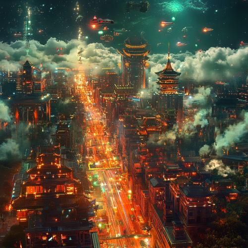 How does Beijing look in the distant future, fascinating, 7000s, creative, realistic, photographic of Beijing city, incredible, castle 3D rendering, different perspective, people, city lights, flying people, flying cars, green clouds