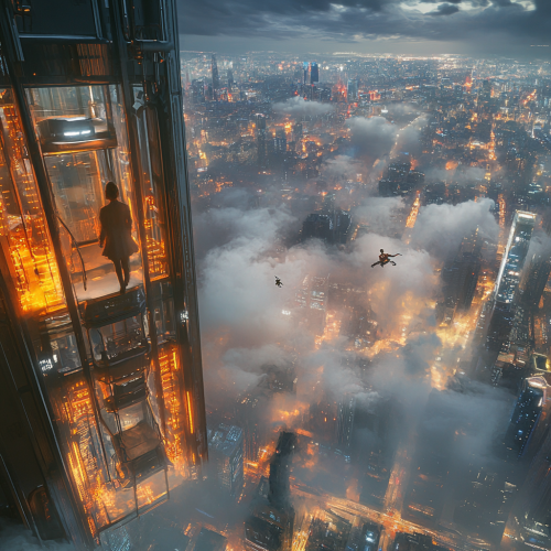 How does Beijing look in the distant future, fascinating, 7000s, creative, realistic, photographic of Beijing city, incredible, castle 3D rendering, different perspective, people, city lights, flying people, flying cars, elevator to the clouds