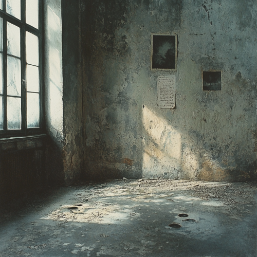 A poignant and reflective scene illustrating the traces or marks left behind by someone or something. The setting features a weathered, abandoned space such as an old, dusty room with faded walls or a deserted path with footprints. Elements like old photographs, handwritten notes, or faded graffiti on walls evoke a sense of past presence and memory. The color palette includes muted, somber tones like grays, browns, and soft blues, creating an atmosphere of nostalgia and reflection. Gentle light filters through broken windows or gaps, highlighting the marks and remnants. The overall mood is contemplative and bittersweet, capturing the lasting impact and emotional residue left behind.