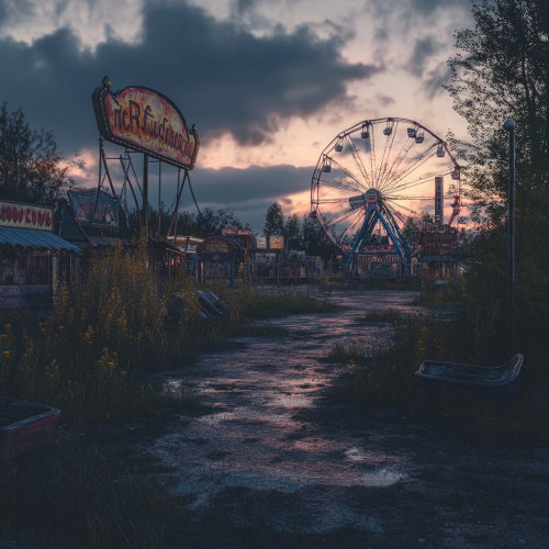An eerie, abandoned fairground at dusk, with rusting rides, faded signs, and overgrown grass, the last light of the day casting long shadows over the forgotten attractions, 1:1 --v 6.1