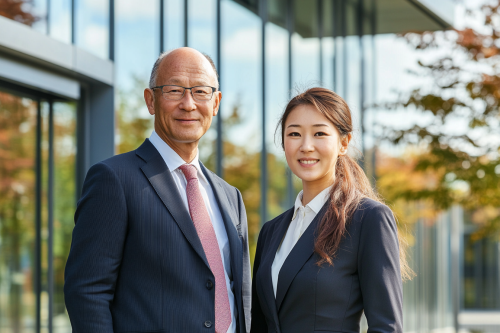 Real-life image of a Japanese man and woman, both 35 years old, dressed in formal business attire, standing confidently in front of their company building, modern glass exterior visible, conveying a professional and successful atmosphere. Photorealistic, realistic photo, 8K resolution --ar 3:2 --v 6.1 --style raw