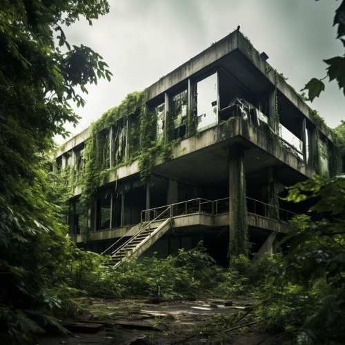an abandoned falling apart overgrown office building
