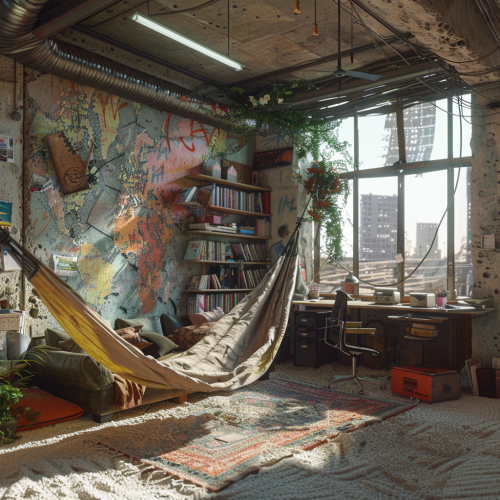 An abandoned industrial building, once covered with sand, but which someone found, cleaned, improved, and turned into a spacious living space. The room has a sofa, a hammock, a large graffiti on the wall, next to it is a work desk with city maps and marks on the wall, shelves with books and several flowers. Outside the window is an abandoned city covered with sand.