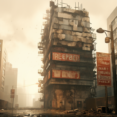 dilapidated commercial skyscraper in post apocalyptic world with faded sign