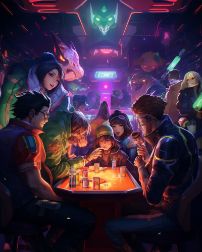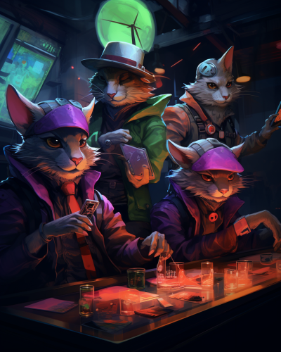 style of cowboy bebop, exuberant alien mice at a futuristic bar wearing virtual reality headsets playing tabletop games, neon orange, green and purple --ar 4:5
