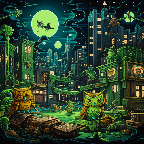 style of cowboy bebop, green alien mice at a futuristic bar wearing virtual reality headsets playing tabletop games, neon orange, green and purple --ar 4:5