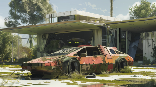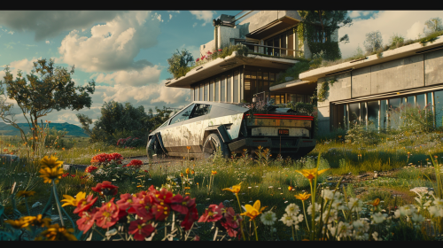 the year is 2054, a broken down tesla cybertruck is on the front lawn of a rundown modern architecture house, cybernetic wildflowers on the lawn --ar 16:9 --v 6.0
