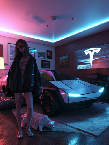 front view, cute emo girl standing in front of a tesla cybertruck with white bear, long sleeve, outfit, photo-realistic hyperbole,phone photograph of an apartment interior decorated with 1980s furniture and lighting --ar 3:4 --v 6.0 --s 0 --style raw
