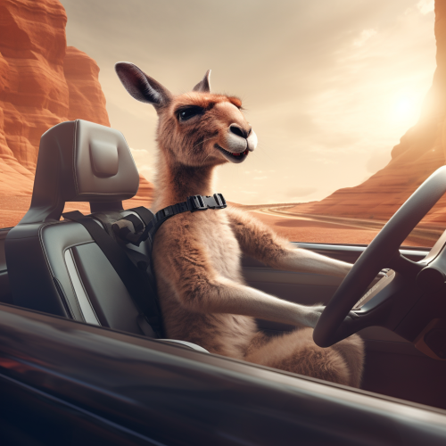 Realistic photo of a kangaroo driving a tesla cybertruck convertible