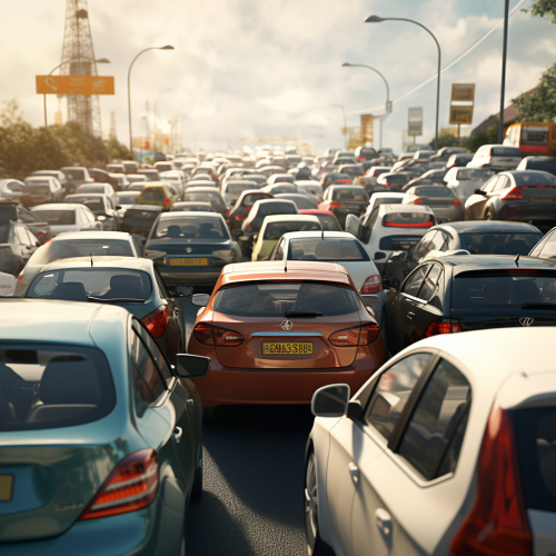Realistic image of a traffic jam on a busy road with multiple vehicles. The scene should show cars slowing down as they approach the traffic jam, maintaining a safe distance from the vehicle in front. Emphasize the importance of driving slowly and keeping sufficient distance. The setting should include visible road signs and congestion. Add details like brake lights, and vehicles of different sizes to enhance the realism. The image should convey a sense of controlled and cautious driving in a traffic jam."
