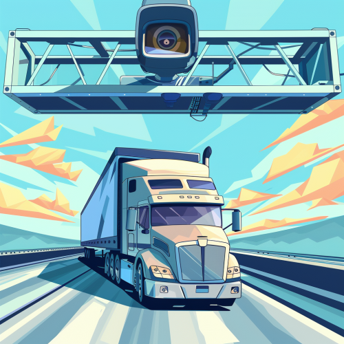 cartoon style, modern, heavy truck on the road, portal above the road with signal video camera, blue, gray, yellow colors